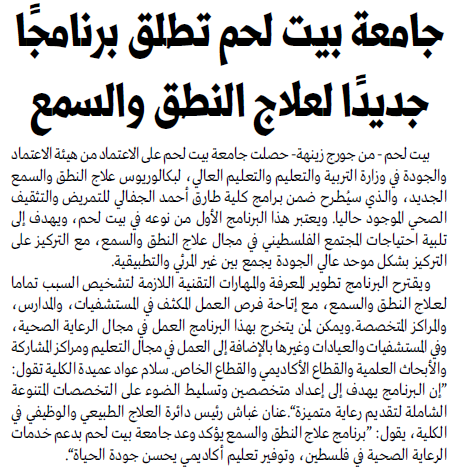 جامعة بيت لحم تطلق برنامجاً جديداً لعلاج النطق والسمع