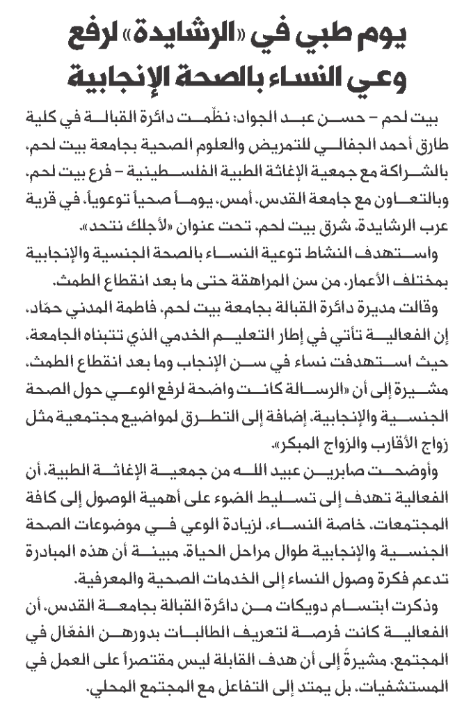يوم طبي في «الرشايدة» لرفع وعي النساء بالصحة الإنجابية
