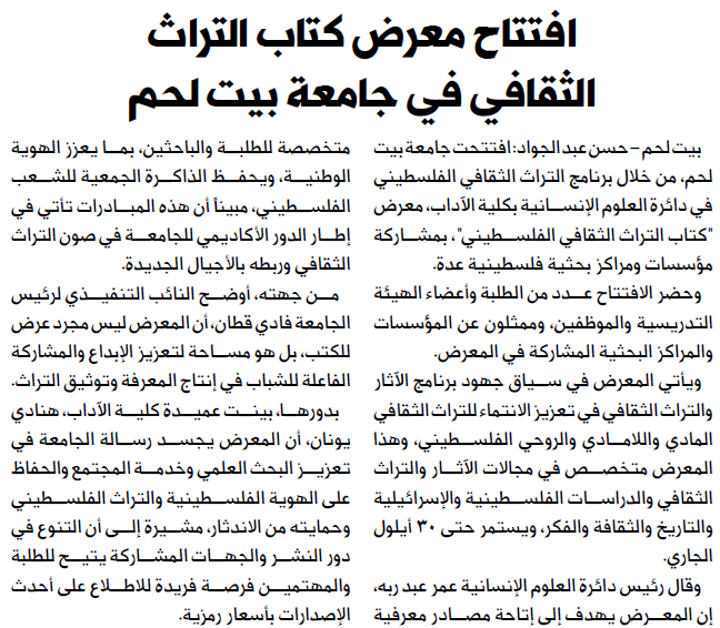 افتتاح معرض كتاب التراث الثقافي في جامعة بيت لحم