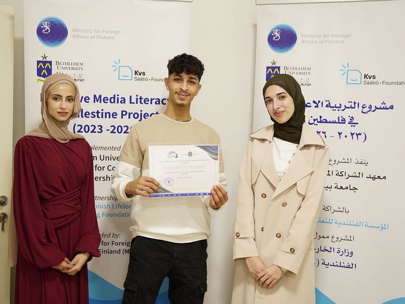 وتأتي هاتان المبادرتان ضمن مشروع التربية الإعلامية الشاملة في فلسطين، الذي ينفّذه معهد الشراكة المجتمعية وبرنامج الإعلام التفاعلي في جامعة بيت لحم بالشراكة مع مركز التعليم المستمر الفنلندي (KVS)، وبدعم من وزارة الخارجية الفنلندية، تأكيدًا على التزام جامعة بيت لحم بدورها المجتمعي في إعداد جيل واعٍ ومؤهّل لمتطلبات الإعلام الرقمي المعاصر.