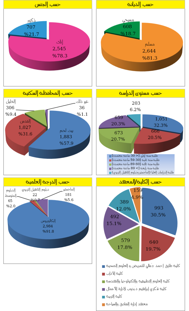 الرسالة والتاريخ الحوكمة ارقام وحقائق سياسات الجامعة الموظفين والهيئة التدريسية اتصل بنا حقائق وأرقام سريعة عن جامعة بيت لحم الموظفون - خريف 2025 الطلبة - خريف 2025 حقائق وأرقام 417 موظفين 19,237 خريج وخريجة 3,298 طالب وطالبة 641 خريجي 2022